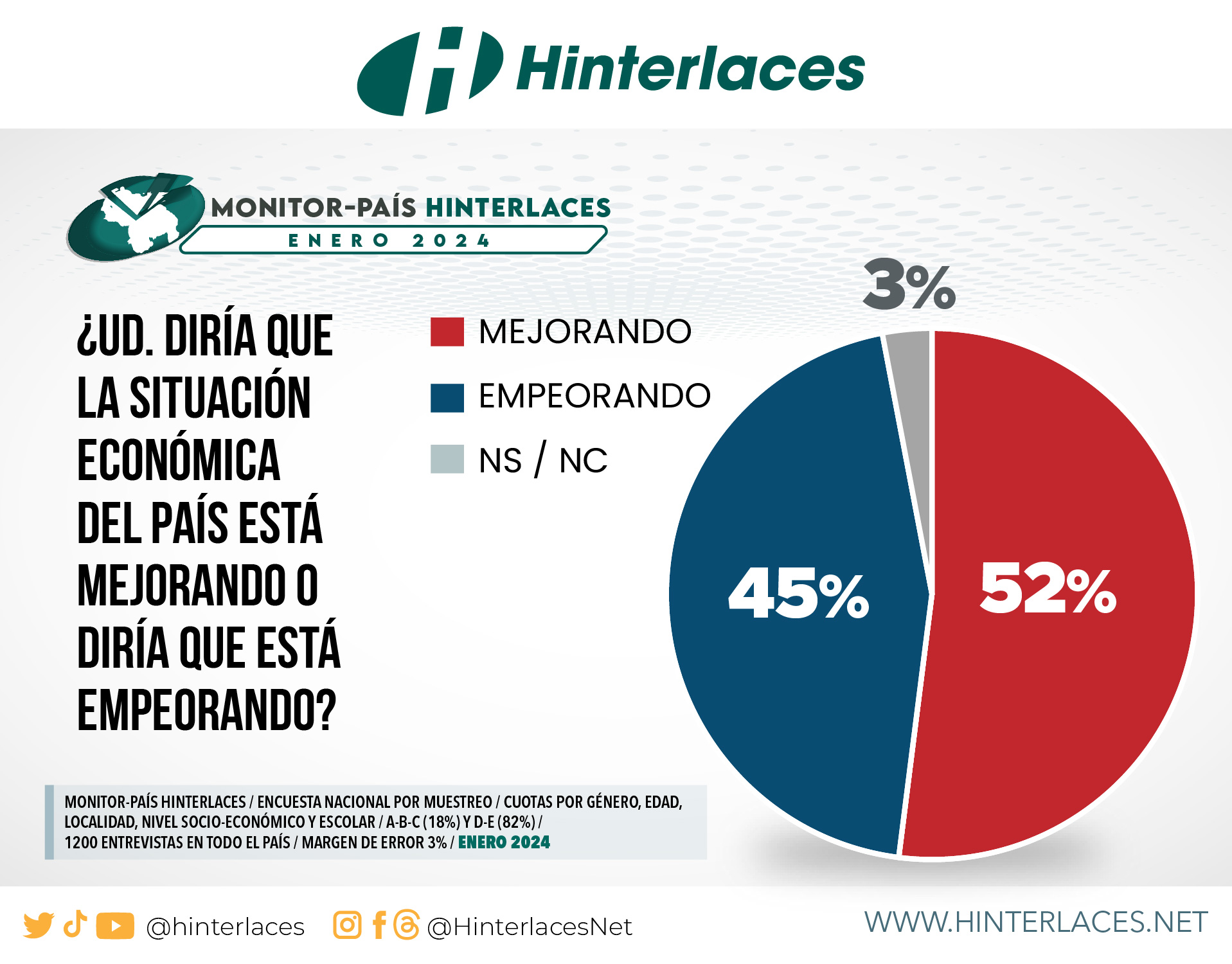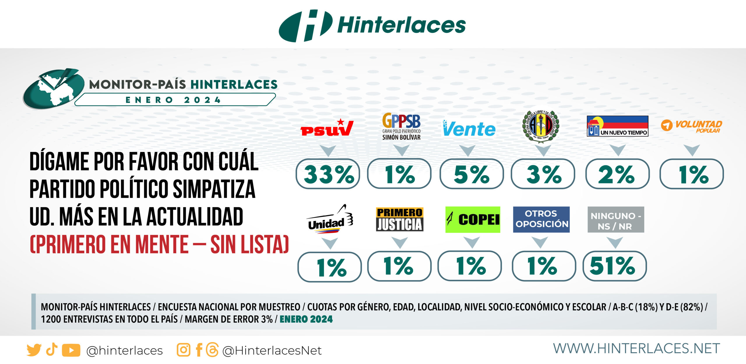El Monitor País realizado por la empresa Hinterlaces en el mes de enero de 2024, refiere que 33% de los venezolanos simpatiza con el Partido Socialista Unido de Venezuela (PSUV).
