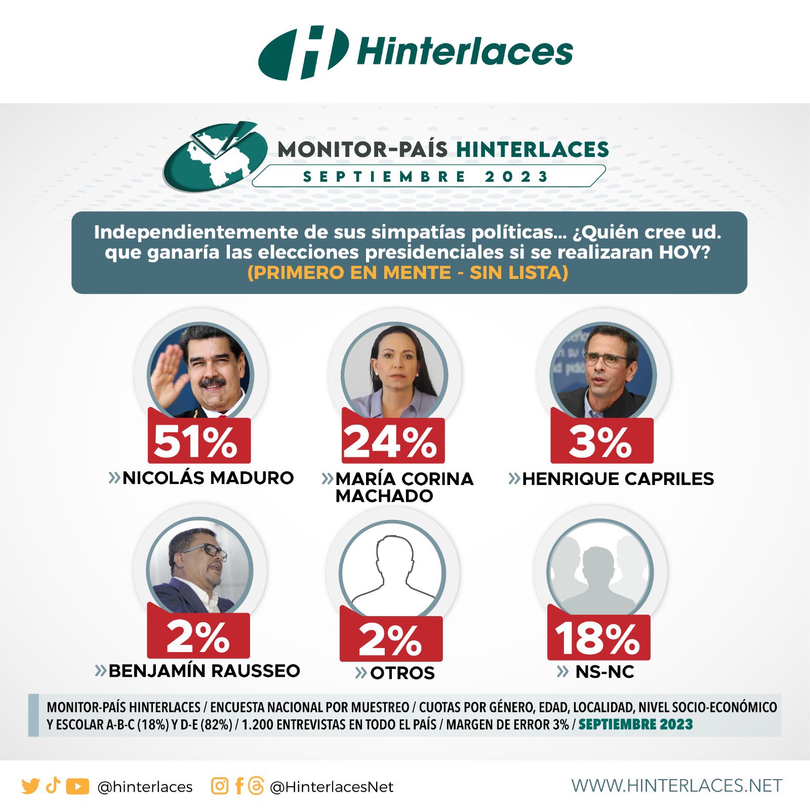 El Monitor País realizado por la empresa Hinterlaces en el mes de septiembre de 2023 refiere que 51% de los venezolanos cree que de realizarse hoy las elecciones presidenciales ganaría el actual presidente de la República, Nicolás Maduro.