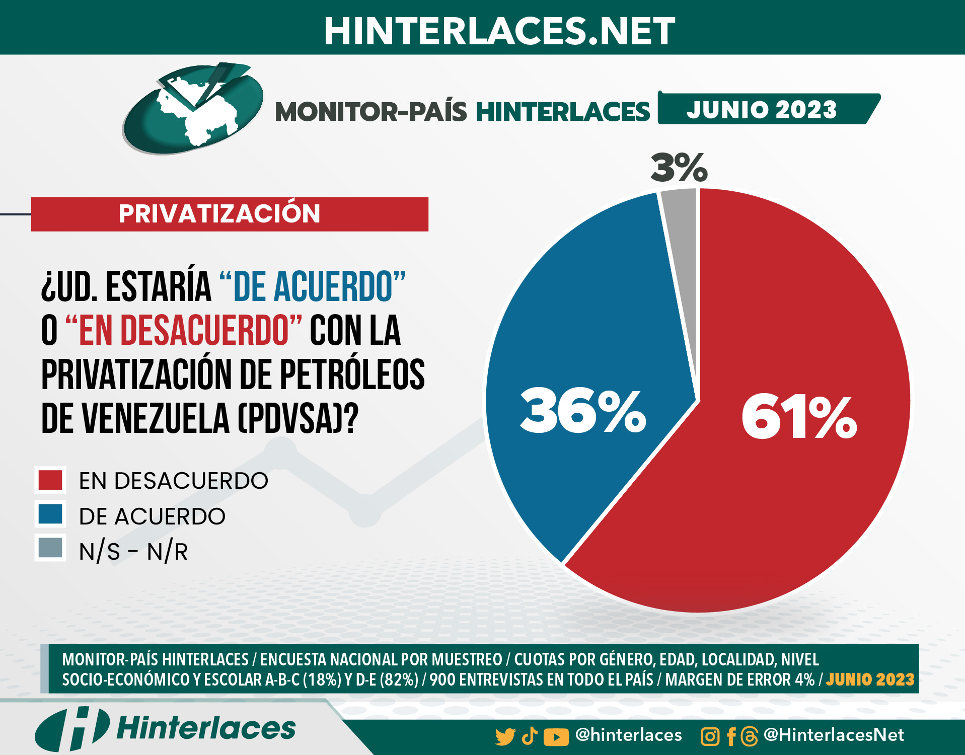 El Monitor País realizado por la empresa Hinterlaces en el mes de junio de 2023 refiere que el 61% de los venezolanos rechaza la idea de privatizar Petróleos de Venezuela.