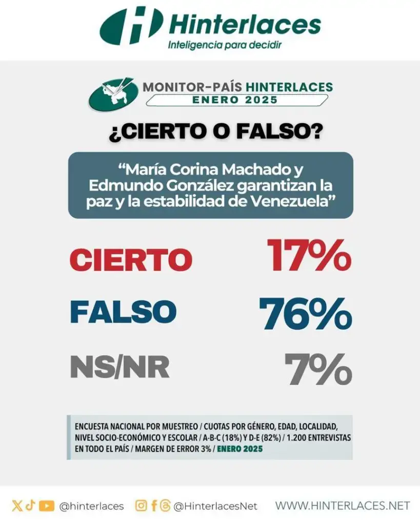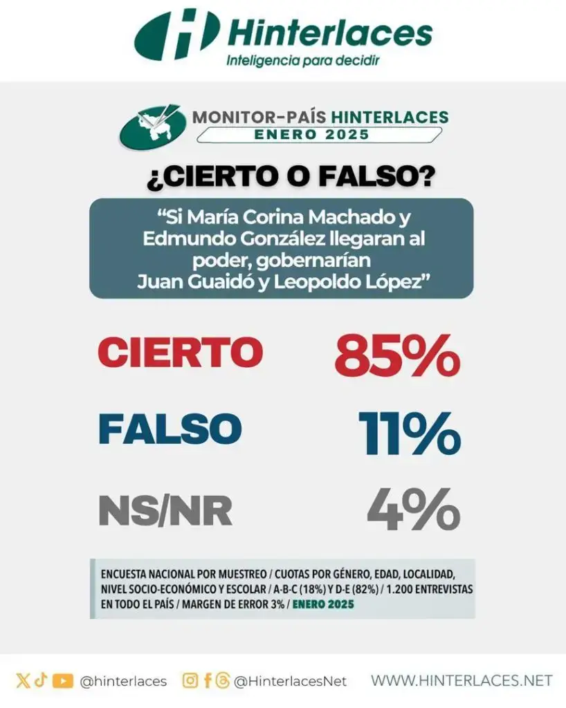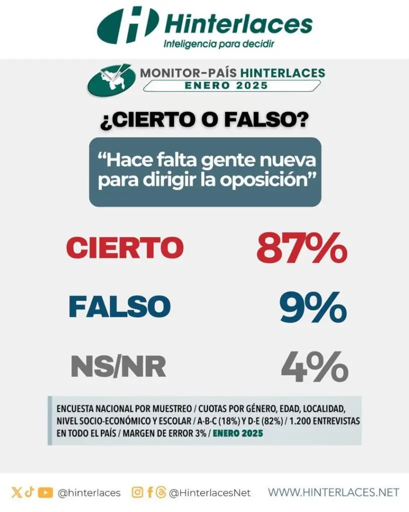 El Monitor País Hinterlaces de enero 2025 impulsó la opinión de los venezolanos para conocer su consideración respecto a la oposición venezolana.