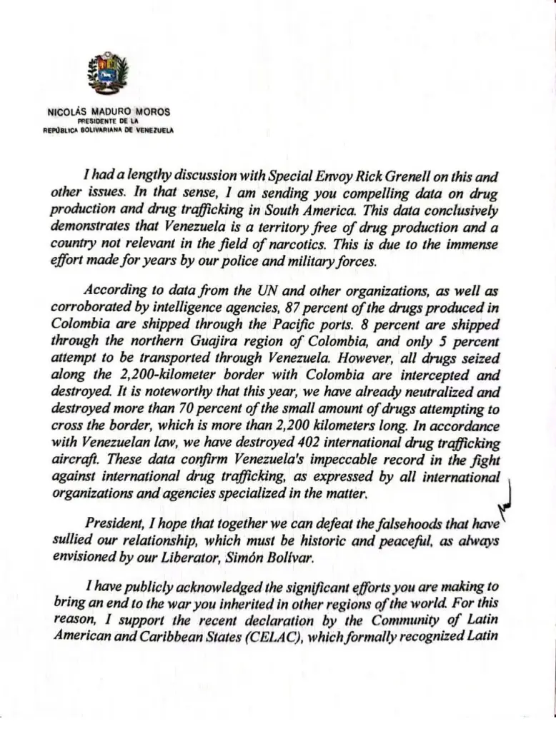 - En el texto, Maduro niega cualquier vínculo del Estado venezolano con el narcotráfico y destaca el entendimiento bilateral sobre repatriaciones.