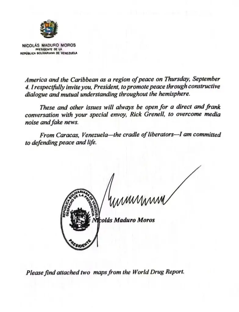 - Nicolás Maduro envió una carta a Donald Trump para proponer conversaciones directas con el enviado especial Richard Grenell, informa Reuters.