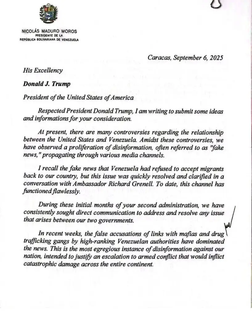 - La misiva fue enviada el 6 de septiembre, entregada a través de un “intermediario suramericano” y difundida en Telegram por la vicepresidenta Delcy Rodríguez.
