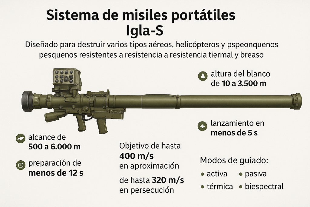 El Igla-S es la evolución de los modelos Igla-1 (SA-16) e Igla (SA-18), con mejor alcance, precisión y resistencia a contramedidas electrónicas. Emplea guiado infrarrojo pasivo que rastrea la firma térmica del objetivo mediante una cabeza buscadora de doble espectro, lo que ayuda a discriminar bengalas. El misil pesa alrededor de 11,3 kg y se lanza desde un tubo de unos 1,7 m sostenido al hombro; el conjunto con equipo de puntería ronda los 19 kg. Porta una ojiva de fragmentación altamente explosiva de 2,5 kg con espoleta de proximidad o impacto.