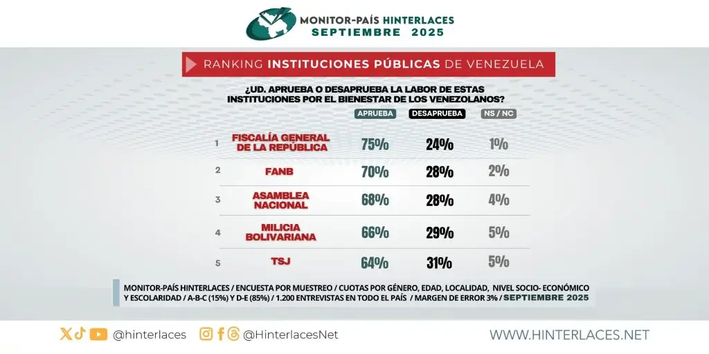 El más reciente Monitor País Hinterlaces, correspondiente a septiembre de 2025, revela que la Fiscalía General de la República (FGR) se ubica como la institución pública mejor valorada por los venezolanos, con un 75% de opinión favorable. Este resultado la posiciona en el primer lugar del ranking nacional de confianza institucional.