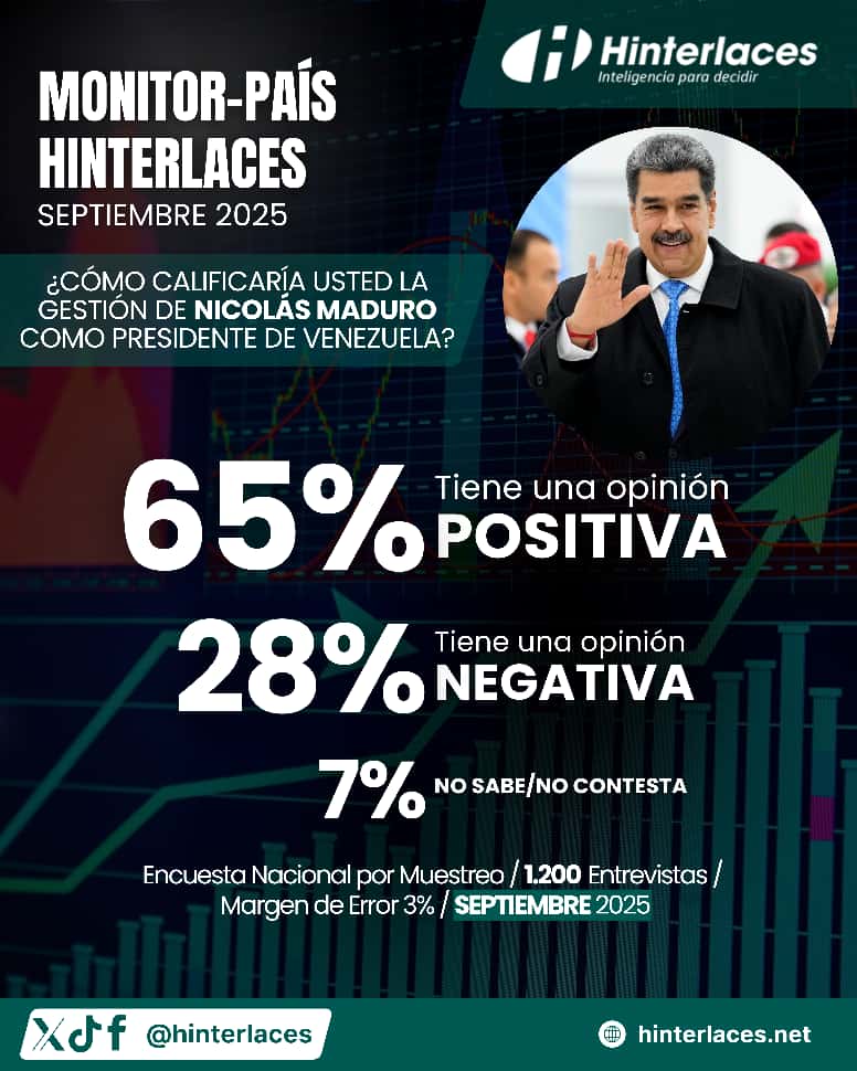 En conclusión, el Monitor-País Hinterlaces de septiembre 2025 confirma que la gestión de Nicolás Maduro mantiene una aprobación mayoritaria y consolidada, lo que constituye un factor decisivo para el rumbo político y económico de Venezuela.