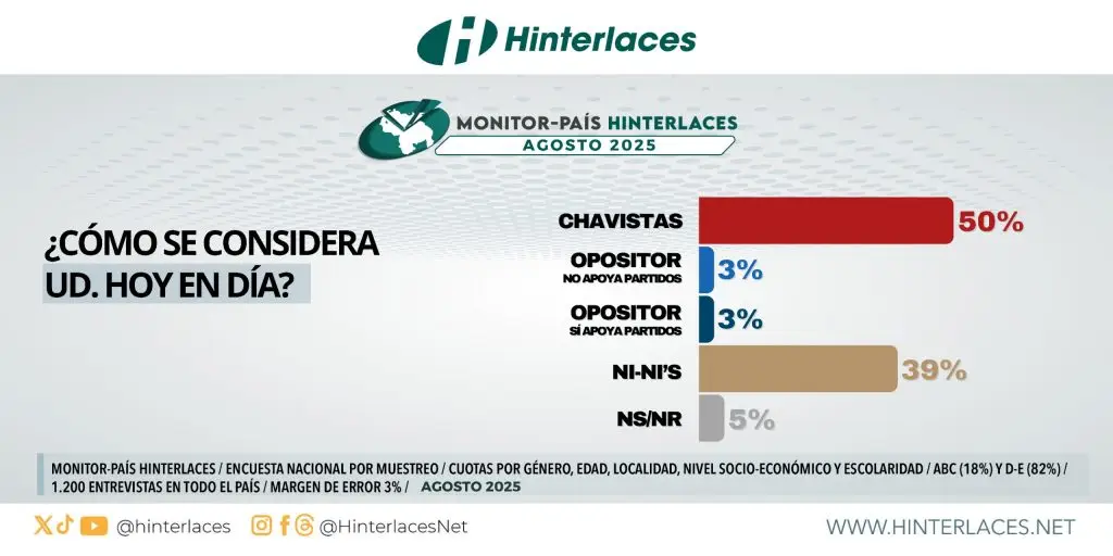 El estudio de Monitor País del mes de agosto revela que 50% de los venezolanos se autodefine como Chavista y apoya al presidente de la República, Nicolás Maduro. El 3% indicó que apoya a los partidos de oposición y 39% que no apoya a ningún partido.