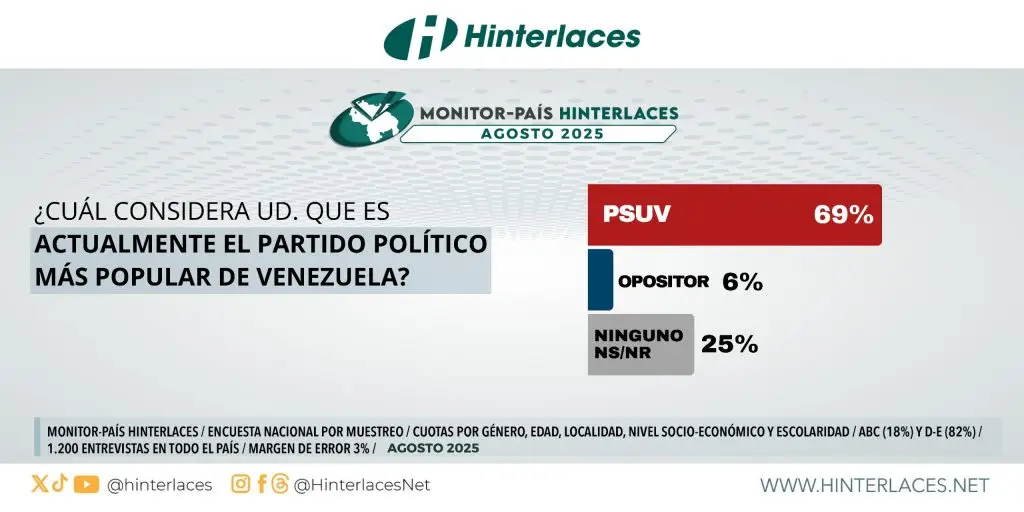 El 69% de los entrevistados aseguró que el partido más popular es el Partido Socialista Unido de Venezuela (PSUV), 6% dijo que son los partidos de oposición y 25% no sabe o no respondió.