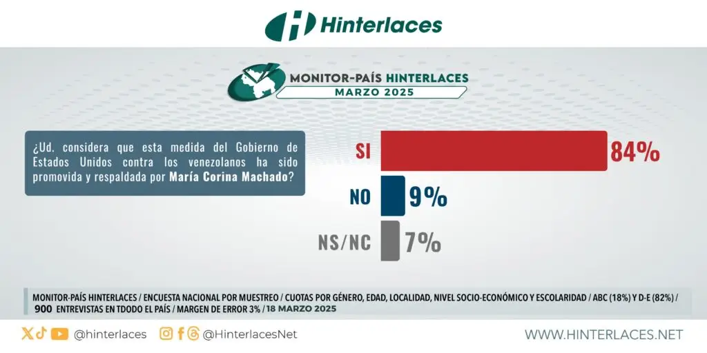 El reciente estudio realizado de Monitor País del mes de marzo de 2025 por la empresa Hinterlaces, refleja que el 84 % de la población venezolana asegura que las medidas adoptadas por el gobierno de Donald Trump en Estados Unidos contra los migrantes venezolanos, han sido promovidas por María Corina Machado.